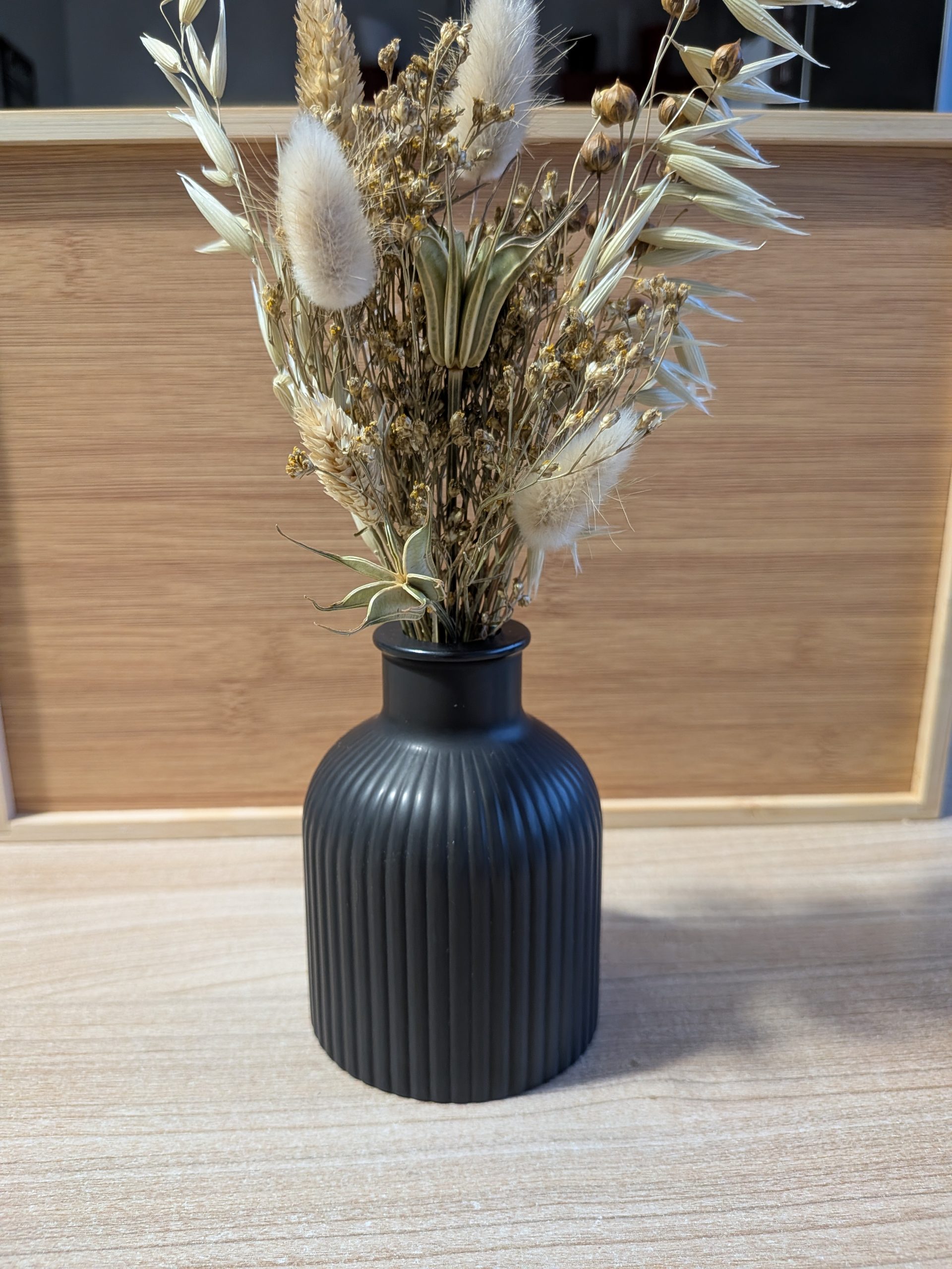 Un mini vase strié qui saura parfaitement mettre en valeur un joli petit bouquet de fleurs séchées.